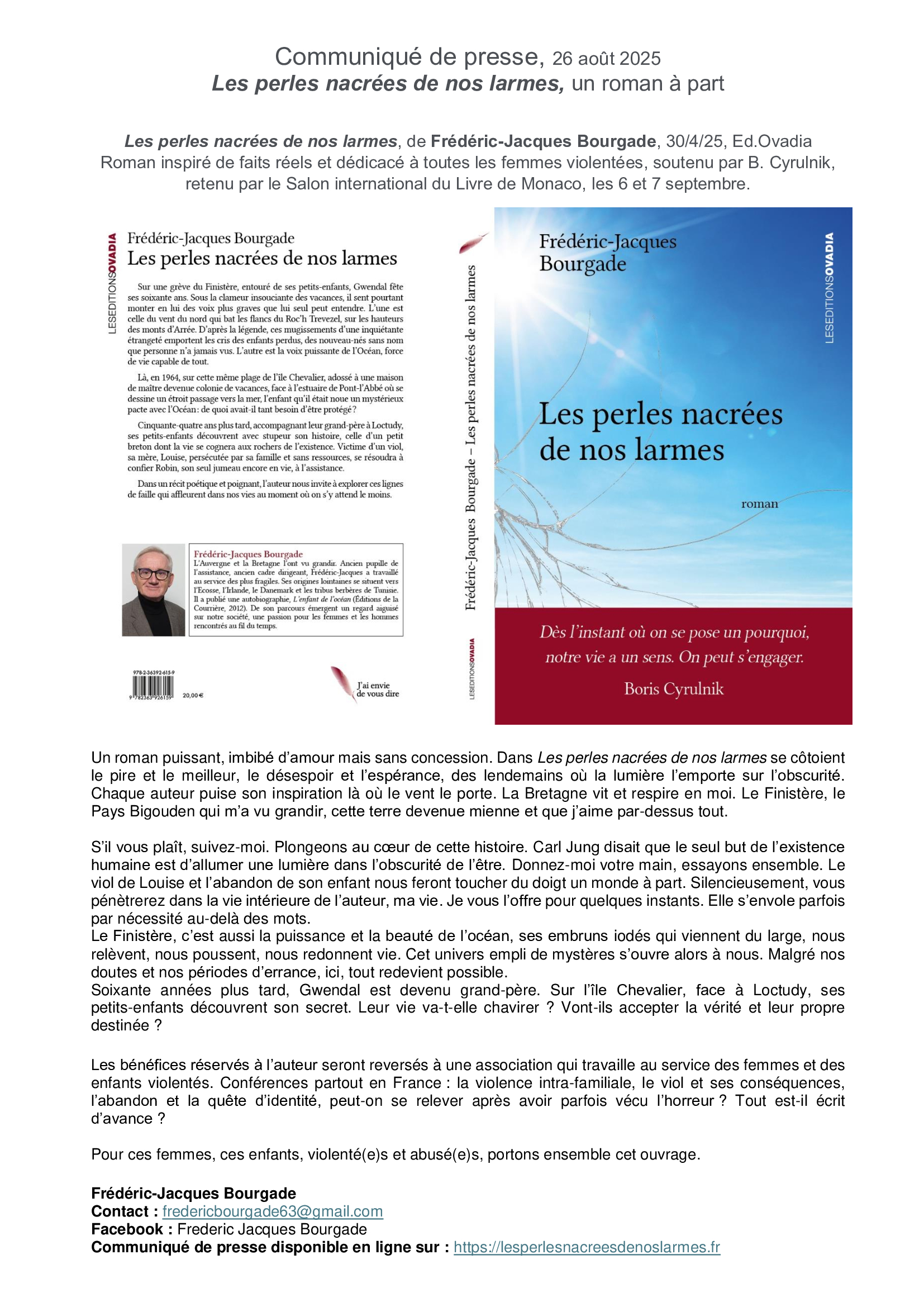 Dans une biographie romancée « L’enfant de l’océan », parue en 2012 et présenté à Loctudy, où il jette régulièrement l’ancre, l’auteur abordait déjà avec pudeur cette enfance marquée par les violences. Il a vu le jour à la suite d’un viol avant d’être abandonné puis adopté et de connaître des violences intrafamiliales. Dans ce premier roman « Les perles nacrées de nos larmes », sorti le 30 avril aux éditions Ovadia, Frédéric Adolph devenu Frédéric-Jacques Bourgade, après avoir pris le nom de jeune de fille de sa mère adoptive, revient sur ce parcours.