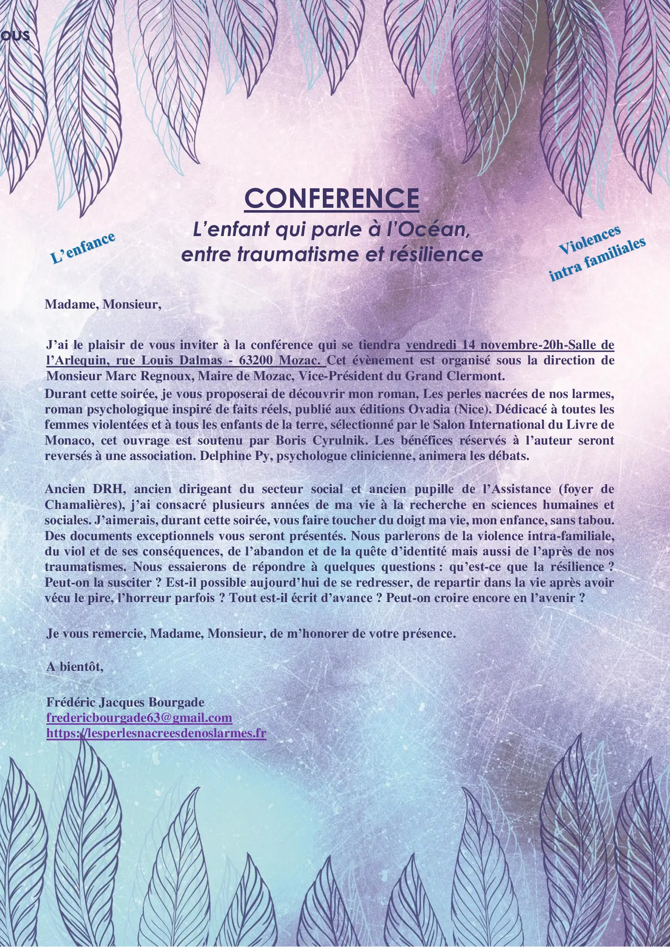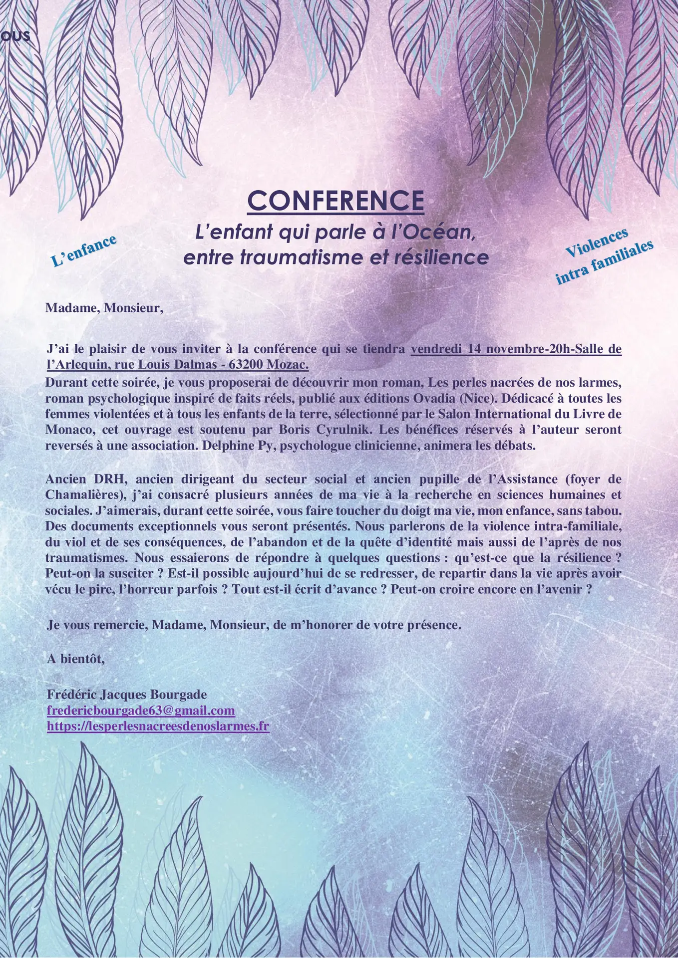 L’ancien pupille de l’assistance devenu directeur de l’UDAF (Union départementale des associations familiales) du Puy-de-Dôme a travaillé pour la protection de l’enfance et est particulièrement admiratif des travaux de Boris Cyrulnik, pionnier de la résilience, ayant lui même surmonté les traumatismes de son enfance. Le neuropsychiatre apporte d’ailleurs son soutien à l’ouvrage avec cette phrase sur le bandeau de couverture : « Dès l’instant où l’on se pose un pourquoi, notre vie a un sens. On peut s’engager ». Pour sensibiliser le public sur ces sujets au cœur de l’actualité, l’écrivain anime des conférences sur les violences et les agressions sexuelles dont sont victimes les femmes mais aussi les enfants et les adolescents, en lien avec différents partenaires : mairies, CCAS, bibliothèques, associations, universités.